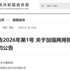 1月6日,商务部网站发布《商务部公告2026年第1号 关于加强两用物项对日本出口管制的公告》。